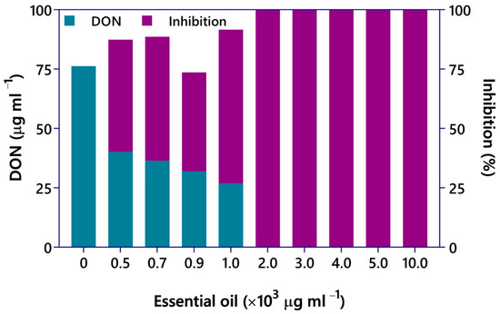 As reported in Table 2, Z. officinale EO also seems to be able to inhibit the production of deoxynivalenol (DON) (Figure 4), a low-molecular-weight trichothecenes belonging to a group of sesquiterpenoids produced by Fusarium spp. [65]. This mycotoxin is quite widespread in crops such as corn, wheat, barley, and potatoes; it is responsible for gastrointestinal inflammation, emesis, and diarrhea in animals. In addition, humans can be affected by DON and may show similar symptoms, but chronic effects as carcinogenic, teratogenic, and immune-suppressive diseases have also been reported as the principal danger. Indeed, the World Health Organization and the Food and Agriculture Organization have recognized DON as a very critical food contaminant [66,67]. As reported by Ferreira et al. (2018) [1], significant to total inhibition of DON production may be achieved by levels of Z. officinale EO ranging between 500 and 2000 μg/mL, respectively.