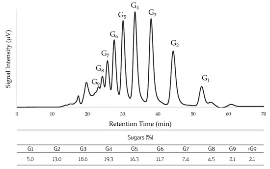 Representative high performance liquid chromatography (HPLC) profile of (1→3)-α-D-glucooligosaccharides obtained by partial acid hydrolysis of L. sulphureus (1→3)-α-D-glucan. In the abbreviation Gn, “n” represents the degree of polymerization. G1: glucose, G2-G9: (1→3)-α-D-glucooligosaccharides with a DP of 2 to 9, >G9: (1→3)-α-D-glucooligosaccharides with a DP more than 9.