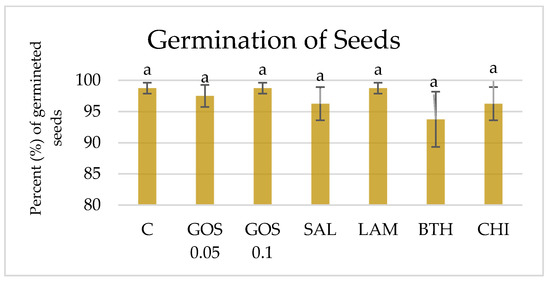 The average percentage (%) of germinated wheat seeds after inoculation with tested elicitors. C–water control, GOS 0.05–(1→3)-α-D-glucooligosaccharides 0.05%, GOS 0.1–(1→3)-α-D-glucooligosaccharides 0.1%, SAL–salicylic acid, LAM–laminarin, BTH–acibenzolar-S-methyl, CHI–chitosan. SD from germinated seeds (n = 120). One-way ANOVA, post hoc Tukey Test p < 0.05. Bars with the different letter are statistically significantly different from each other and control object.