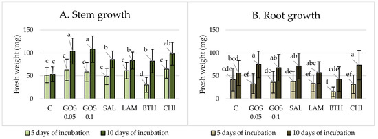 The fresh weight (FW) of (A) wheat stems and (B)roots after 5 and 10 days of incubation in the presence of elicitor solutions. C–water control, GOS 0.05–(1→3)-α-D-glucooligosaccharides 0.05%, GOS 0.1–(1→3)-α-D-glucooligosaccharides 0.1%, SAL–salicylic acid, LAM–laminarin, BTH–acibenzolar-S-methyl, CHI–chitosan. SD from FW of stems/roots (n = 60). One-way ANOVA, post hoc Tukey Test p < 0.05. Bars with the different letter are statistically significantly different from each other and control object.