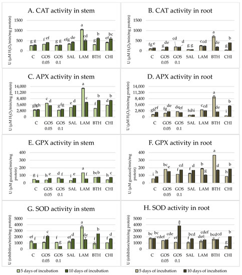 The activity of catalase (CAT), ascorbate (APX) and guaiacol (GPX) peroxidases, and superoxide dismutase (SOD) in wheat stems (A,C,E,G) and roots (B,D,F,H) after 5 and 10 days of incubation in the presence of elicitors. C–water control, GOS 0.05–(1→3)-α-D-glucooligosaccharides 0.05%, GOS 0.1–(1→3)-α-D-glucooligosaccharides 0.1%, SAL–salicylic acid, LAM–laminarin, BTH–acibenzolar-S-methyl, CHI–chitosan. One-way ANOVA, post hoc Tukey Test p < 0.05 (bars with the different letter are statistically significantly different from each other and control object). SD was measured in three biological replicates (n = 3) from plant extract sample (1g FW/8 mL of buffer). Bars with the different letter are statistically significantly different from each other and control object.
