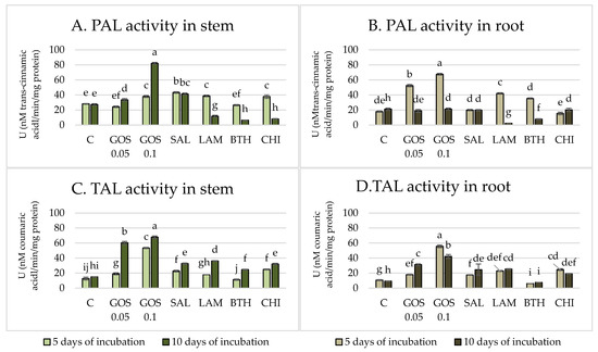 The activity of phenylalanine ammonia-lyase (PAL) and tyrosine ammonia-lyase (TAL) in wheat stems (A,C) and roots (B,D) after 5 and 10 days of incubation in the presence of elicitors. C–water control, GOS 0.05–(1→3)-α-D-glucooligosaccharides 0.05%, GOS 0.1–(1→3)-α-D-glucooligosaccharides 0.1%, SAL–salicylic acid, LAM–laminarin, BTH–acibenzolar-S-methyl, CHI–chitosan. SD in three replicants. One-way ANOVA, post hoc Tukey Test p < 0.05 (bars with the different letter are statistically significantly different from each other and control object). SD was measured in three biological replicates (n = 3) in plant extract samples (1g FW/8 mL of buffer). Bars with the different letter are statistically significantly different from each other and control object.