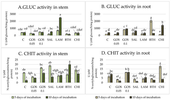 The activity of glucanase (GLUC) and chitinase (CHIT) in wheat stems (A,C) and roots (B,D) after 5 and 10 days of incubation in the presence of elicitors. C–water control, GOS 0.05–(1→3)-α-D-glucooligosaccharides 0.05%, GOS 0.1–(1→3)-α-D-glucooligosaccharides 0.1%, SAL–salicylic acid, LAM–laminarin, BTH–acibenzolar-S-methyl, CHI–chitosan. One-way ANOVA, post hoc Tukey Test p < 0.05 (bars with the different letter are statistically significantly different from each other and control object). SD was measured in three biological replicates (n = 3) in plant extract samples (1g FW/8 mL of buffer). Bars with the different letter are statistically significantly different from each other and control object.