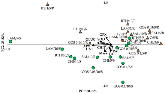 Diagram of the Principal Component Analysis (PCA), describing the activity of immune enzymes, CAT–catalase, APX–ascorbic peroxidase, GPX–guaiacol peroxidase, PAL–phenylalanine ammonia lyase, TAL–tyrosine ammonia-lyase, SOD–superoxide dismutase, GLUC–glucanase, and CHIT–chitinase in 5- and 10-day-old wheat tissue―stem (S) and root (R), after the application of water control (C), commercial elicitors (LAM–laminarin, BTH–benzo (1,2,3) thiadiazole-7-carboxylic acid S-methyl ester, and CHI–chitosan), and oligomers (GOS 0.05–0.05% (1→3)-α-D-glucooligosaccharides and GOS 0.1–0.1% (1→3)-α-D-glucooligosaccharides). Graphic designations: green circle—the stem, brown triangle—root. CAT, APX, GPX, PAL, TAL, SOD, GLUC, and CHIT—average activity expressed in the U unit; Mass—stems and roots fresh weight (in milligrams). Graphic designations: green circle—the stem, brown triangle—the root.