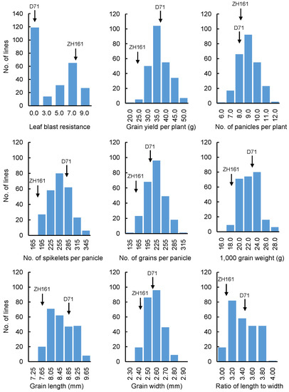 Distribution of leaf blast resistance and eight yield traits in the D71/ZH161 RIL population.
