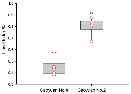 Insect index of Caoyuan No.2 and Caoyuan No.4. Bars represent the mean ± SE (n = 3), double asterisk indicates p ≤ 0.01.