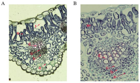 Structural comparison of Caoyuan No.2 and Caoyuan No.4. (A) Leaf cross section of Caoyuan No.2. (B) Leaf cross section of Caoyuan No.4. a, collenchyma; b, phloem; c, cambium; d, lignin layer; e, palisade tissue; f, air-chamber.
