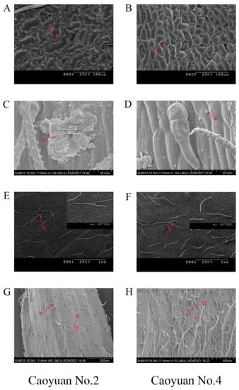 Leaf and stem surface scanning electron photomicrographs of Caoyuan No.2 and Caoyuan No.4. (A) Epidermal cells and stomatal features of Caoyuan No. 2. (B) Epidermal cells and stomatal features of Caoyuan No.4. (C) Epidermal wax of stem in Caoyuan No. 2. (D) Epidermal wax of stem in Caoyuan No.4. (E) Trichomes of leaf in Caoyuan No. 2. (F) Trichomes of leaf in Caoyuan No. 4. (G) Trichomes of stem in Caoyuan No. 2. (H) Trichomes of stem in Caoyuan No. 4. a, wax; b, non-glandular trichomes; c, non-glandular trichomes; d, glandular trichomes; s, stomata.