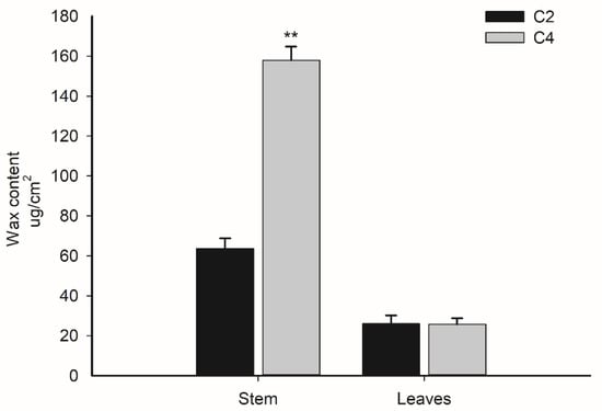 Wax content of Caoyuan No.2 and Caoyuan No.4 determined using a gas phase hydrogen flame detector. C2, Caoyuan No.2; C4, Caoyuan No.4. Bars represent the mean ± SE (n = 3), double asterisks indicate p ≤ 0.01.