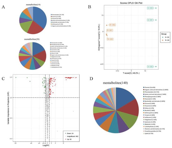 Differentially accumulating metabolites between Caoyuan No.2 and Caoyuan No.4. (A) Differentially accumulating metabolites determined in either Caoyuan No. 2 or Caoyuan No. 4. (B) The score plots of orthogonal partial least-squares discriminant analysis (OPLS-DA); S_CK, Caoyuan No.2; R_CK, Caoyuan No.4. (C) Upregulated and downregulated metabolites detected in Caoyuan No.2 compared with Caoyuan No.4 (D) Pie chart depicting the biochemical categories of the differential metabolites identified between Caoyuan No.2 and Caoyuan No.4.