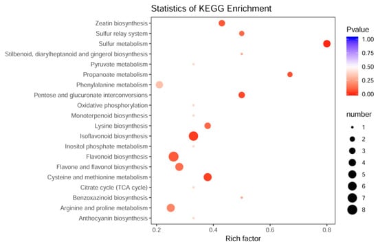 Differential accumulated metabolites interact in organisms to form different pathways. According to the KEGG annotation and enrichment results, the relative metabolic pathways are shown in Figure 6. It was shown that the DAMs were most significantly enriched to flavonoid biosynthesis (ko00941), isoflavonoid biosynthesis (ko00943), flavone and flavonol biosynthesis (ko00944), and cysteine and methionine metabolism (ko00270). Interestingly, this accorded with our previous observations on thrips-induced defense in alfalfa []. These results suggested that the pathways, such as flavonoid biosynthesis (ko00941), isoflavonoid biosynthesis (ko00943) and flavone and flavonol biosynthesis (ko00944), contributed to both constitutive and thrips-inducible plant defense in alfalfa. The roles of flavonoids or isoflavonoids in plants thrips defense have also been reported by other investigators [,,].