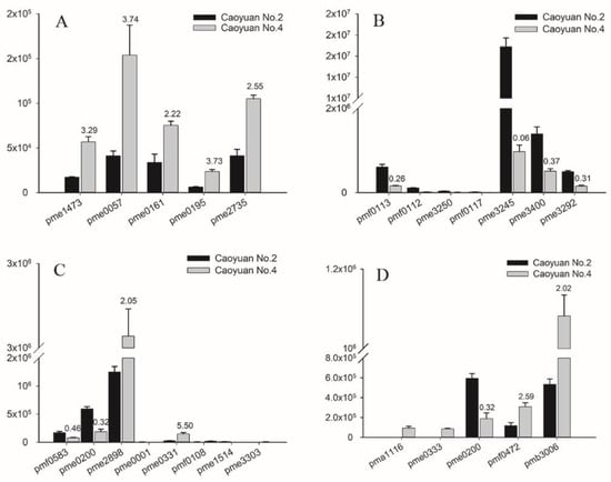 The widely targeted metabolomics analysis of leaves of both cultivars was performed using methods described in our previous study []. The sample processing, extraction, and metabolites detection were performed by Biomarker Technologies Co., Ltd. (Beijing, China) following their standard procedures []. Quadrature signal correction partial least squares-discriminant analysis (OPLS-DA) and variable importance in projection (VIP) were used to obtain the maximum differences between the cultivars. Metabolites with VIP > 1.0, fold change ≥2 and fold change ≤0.5 were considered to be differential metabolites for group discrimination. The KEGG (Kyoto Encyclopedia of Genes and Genomes) database was used to annotate and display the differential metabolites [].