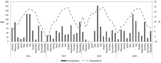 Average mean temperature and precipitation data for the 2016–2020 experimental years.