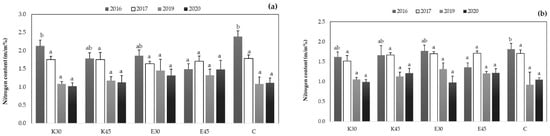 In the ‘GK Emese’ variety (Figure 2c), it can be stated that the highest N content in the grains occurred in the first year of cultivation. The highest values were measured for the E45 treatment (2.1 m/m%) and the lowest for the K30 sample (1.0 m/m%). In 2017, there was some decrease in plant samples for all treatments. Almost the same course can be observed in the last two growing years. We measured a significant difference in 2016 and 2019. The K30 treatment (p = 0.047) had significantly less N content compared to the E 45 treatment with the highest value. In the latter case, we also measured a significantly higher nitrogen content in the plant sample of the 45 mm irrigated effluent treatment compared to the K30 (p = 0.005), C (p = 0.018) and K45 (p = 0.029) samples.