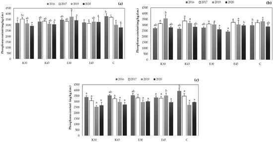 Lower phosphorus values were measured for the ‘Farmsugro 180’ variety in the first experimental year compared to the other years (Figure 3b). The highest value was recorded by C treatment (2987 mg/kg d.m.), while the lowest was recorded by E45 treatment (2430 mg/kg d.m.). In the following two experimental years, the values show an upward trend. However, a repeated decline in phosphorus levels can be observed in 2020. The significant differences were detected between the applied treatments, with the exception of the year 2017. In 2016, we measured a significantly lower concentration for the E45 (p = 0.004) sample compared to the value of treatment C. In 2019, the K30 (p = 0.043) sample had a significantly higher phosphorus concentration. Compared to the E45 sample with the highest value, the last year was characterized by significantly lower phosphorus content in E30 (p = 0.048).