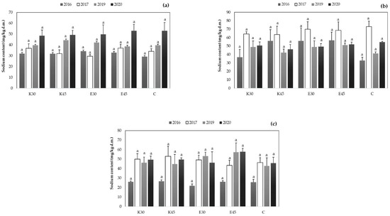In 2016, the sodium (Na) content detected in the grains of the ‘Alföldi 1’ variety proved to be the lowest, where its measured values ranged from 29 to 34 mg/kg d.m (Figure 5a). Some decreases were observed in the 2017 and 2019 cultivation years; however, even the highest Na content does not exceed 44 mg/kg d.m. In the last experimental year, a significant increase in Na levels was observed for all treatments. In this case, treatments E45 and C exceed 100 mg/kg d.m. The effects of the treatments were compared within that cultivation year, where no significant differences were detected.