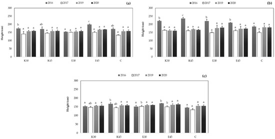 For ‘Farmsugro 180’ (Figure 6b), higher plant heights were also detected in the first year of cultivation, with the lowest plants in treatment C (187 cm) and the highest in treatment K45 (236 cm). In the following years, a decrease was observed with all treatments. In 2017, the height of the ‘Farmsugro 180’ variety was between 149 and 164 cm. In 2019 and 2020, an increase of 10% was observed, during which the height ranged from 161 to 182 cm. In 2016, a significant difference was found between the treatments, where plants of other treatments grew significantly lower (p ≤ 0.05) compared to K45 treatment.