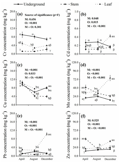 Figure 2. Seasonal changes of heavy metal concentrations in the underground organs, stems and leaves. M and O and represent sampling months and plant organs. Bars indicate standard errors of means. Different English letters indicate significant differences among the three sampling months at p < 0.05. Different Greek letters indicate significant differences among the underground organs, stems and leaves at p < 0.05.