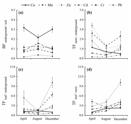 The average TF values of all HM elements were higher than that of BF during the whole growth season (Figure 3). Among the three sampling dates, the BFunderground/soil value of Cu was higher than that of the other HM elements (Figure 3a). It is particularly true for the BFunderground/soil value (0.32) of Cu in April, suggesting a strong Cu absorption ability of the underground organs during this time period. The BFunderground/soil value of Pb (0.016–0.037) was always the lowest among all the HM elements. For all the HM elements except Cu, no variations were observed between different sampling dates in terms of the BFunderground/soil value. More HM elements absorbed by the underground organs were transformed to leaves than stems. In April, a higher TFleaf/underground value (Figure 3c) was observed for the most HM elements than the TFstem/underground value (Figure 3b). For example, the TFleaf/underground values for Pb, Cu, Cd and Cr in April reached to 5.46, 1.16, 1.04 and 0.76, respectively, whereas values for TFstem/underground were 1.82, 1.15, 0.56 and 0.17, respectively. Toward the end of the growing season, more HM elements were transformed to leaves than stems. The average TFleaf/underground value for all the HM elements was 2.36, whereas for the TFstem/underground it was only 1.13. At the end of the growing season (December), the highest TFleaf/stem value (10.16) for Pb was recorded.