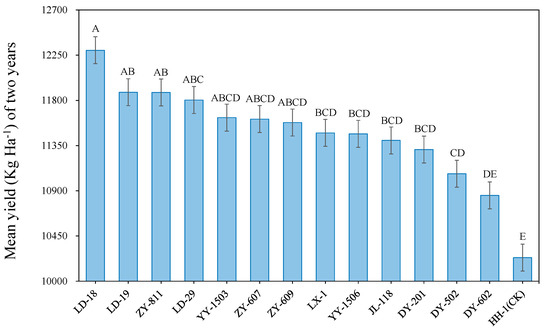 Moreover, the multiple comparison results showed that the mean yield of 13 evaluated hybrids were all higher than the control hybrid HH-2 (Figure 1 and Table S2). Moreover, there were no significant differences among the top 7 varieties, LD-18, LD-19, ZY-811, LD-29, YY-1503, ZY-607, and ZY-609. Additionally, LD-18 had over 20.16% yield advantage over HH-2 (Table S2). These results indicated that LD-18, LD-19, and ZY-811 were the more productive genotypes in 2020 and 2021.