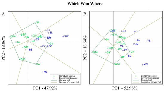 Figure 2 showed the “which-won-where” polygon view, and each environment group had the same best genotype [16,31]. Therefore, we could visually identify some mega environments from Figure 2. In detail, LD-18 and LD-29 performed well under the first and second mega-environment in 2020, respectively. LD-18, LD-19, and YY-1506 were the highest-yielding hybrids adapted to their own mega environment zones in 2021. Generally, the polygon view exposed the most productive hybrids in each environmental group [14,32,33], and further demonstrated that these varieties could guide the ecological planting, and were recommended for widespread commercial use. However, further evaluation is required under more multi-environments over seasons.