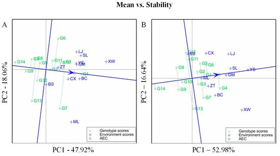 12. Yan, W.; Kang, M.S.; Ma, B.; Woods, S.; Cornelius, P.L. GGE biplot vs. AMMI analysis of genotype-by-environment data. Crop Sci. 2007, 47, 643–655. [Google Scholar] [CrossRef]