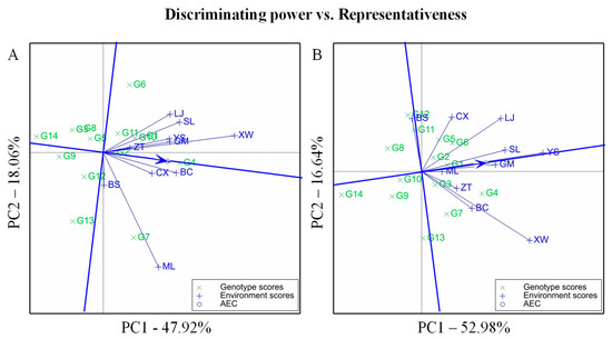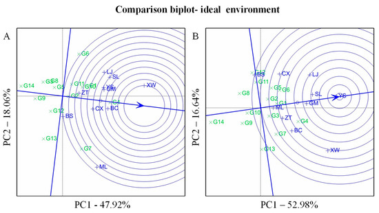 16. Yan, W. GGE biplot: A windows application for graphical analysis of multi-environment trial data and other types of two-way data. Agron. J. 2001, 93, 1111–1118. [Google Scholar] [CrossRef]