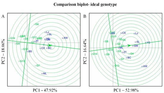The GGE biplot, which is a modification of the best linear unbiased prediction (BLUP), and the additive main effects and multiplicative interaction analysis (AMMI), is more superior because it displays both the effects of the genotypes and the GEI, which are the two sources of variation [11,12]. In other words, the GGE biplot analysis is a method in analyzing GEI and MET data for identifying and selecting the superior genotypes in specific environments [13,14]. Nowadays, GGE biplot analysis is the more widely used for integrating genotype main effect with the GEI effect [7], since it could benefit grouping mega environments [11], identify ideal environments with high representative and discriminative [15], and select genotypes with high grain yields and stability [16]. Additionally, GGE biplot analysis has been widely used in the study of maize [7,17,18,19,20], cotton [21], potato [14,22], sweet potato [23], wheat [24,25], and pigeon pea [26].