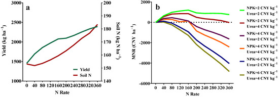 Simulated yield and soil N under different N rates (a) and marginal net return (MNR) under different nitrogen rates and N fertilizer prices (b) over 30 seasons (the normal price was NPK compound fertilizer = 2 CNY kg−1; urea = 2 CNY kg−1).