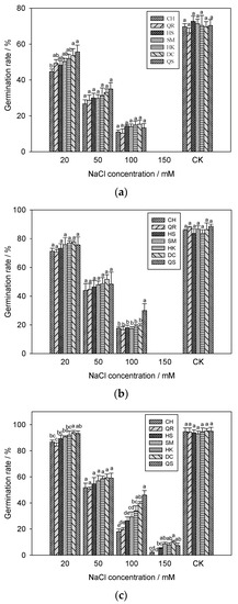 The salinity stress inhibited the germination of the E. crus-galli seeds, and a negative relation between germination rate of the seed and the corresponding resistance of E. crus-galli was concluded. In addition, the germination rate at 96 h (Figure 1c) was significantly higher than that at 72 h (Figure 1b) and 48 h (Figure 1a) post treatment, while there were no significant differences in the resistance levels in the plants without NaCl treatment (Tables S1–S3).