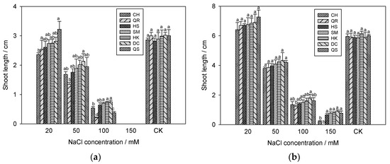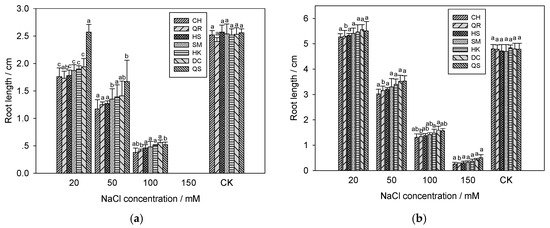 In this study, similar reduction in the lengths of shoots (Figure 2, Tables S4 and S5) and roots (Figure 3, Tables S6 and S7) of E. crus-galli was also observed, when treated with salinity. The higher the concentration of NaCl, the greater the inhibitory effect on shoots and roots of E. crus-galli. The length at 7 days (Figure 2b and Figure 3b) was higher than that at 4 days post treatment (Figure 2a and Figure 3a). With increasing quinclorac-resistant level, the growth of young shoots and roots of E. crus-galli was obviously affected by the NaCl solution. When 20 mM NaCl was applied, positive effects on the shoots and roots growth of seven populations were detected, while a severe inhibition was observed with 150 mM NaCl, especially for the QR biotype, which was one of the types most resistant to quinclorac. There were no significant differences in the growth of the shoots and roots among the seven populations without NaCl treatment.