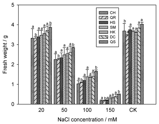 The fresh weight (g) of E. crus-galli with four NaCl concentrations at 21 days after treatment. Lowercase letters are expressed as least square means ± standard error (p < 0.05).