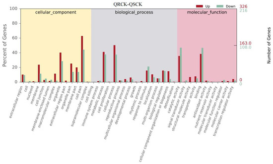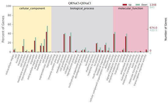 Gene Ontology (GO) analysis of the DEGs between two E. crus-galli populations treated with 50 mM NaCl. GO analysis was performed at level 2 for the three main categories.