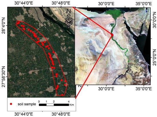 The area under study is adjacent to the El-Moheet drainage on the west side of the Nile River, El-Minia governorate, Egypt. El-Moheet drainage is located a few kilometers to the west of Minya Governorate and passes through Abu Qurqas district from the south to Samalut in the north. For nearly 100 years, southern parts have received wastes generated from the Abu Qurqas sugar plant. The study area covers about 2894 hectares and is located between 30°43′09″ to 30°48′51″ Longitude and 27°56′30″ to 82°04′35″ Latitude (Figure 1). The surface of the study area is flat to almost flat as the elevation ranges between 38 and 41 m above sea level toward the north. The study area is under an arid climate with a hot summer, warm winter, high evaporation, and low rainfall intensity. The meteorological station of El Minia Governorate (EMA, 2020) was recorded for 35 years (1985–2020) as follows: the average monthly temperature ranges between 12.9 °C in January and 30.2 °C in August. Rainfall is rare throughout this region; the total mean precipitation is 28.0 mL per year []. The studied area is alluvial deposits from the Nile River, and the dominant soil texture ranges between silt and clay.