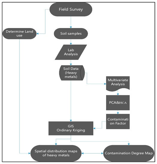 Principal component analysis (PCA) is used as a mathematical process to extract the variables from the original data and group them into factors (principal components) [,]. PCA was applied to assess soil contamination with some selected heavy metals in other studies [,].