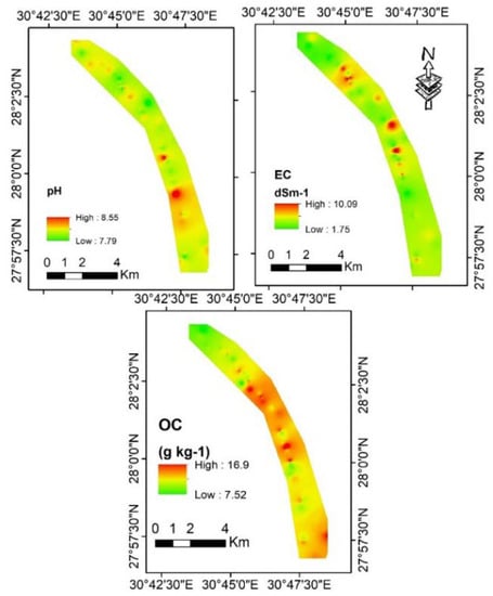 Spatial distribution of soi pH, EC, and organic carbon (OC).