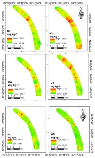 The spatial distribution maps of the studied heavy metals showed their high concentrations observed in the northern parts of the study area. These parts are adjacent to urban areas, where the irrigation channels and drainages are subject to various pollution sources. These findings are consistent with similar studies in the Nile valley and Delta [,,]. On the other hand, southern parts of the study area were characterized by low concentrations of most of the selected elements except for Co, as its concentrations were significantly high, which may be associated with the human activities and the agricultural management practices in these areas in terms of fertilization use [,].