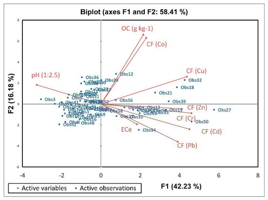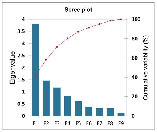The Kaiser–Meyer–Olkin (KMO) test was used to determine the adequacy of sampling for all variables before principal component analysis (PCA) []. The KMO value was 0.729 and indicated that soil sampling was acceptable as the KMO value was >0.6. A PCA was achieved based on 60 observations and 9 variables. The Scree plot illustrates the eigenvalue and cumulative variability (%) of different principal components or factors (Figure 5). Data detailed in Table 4 showed that only three factors with cumulative variability of 71.39% have eigenvalues > 1, and the rest of the factors were ignored according to Kaiser []. The first factor F1 has the highest eigenvalue and variability (3.8 and 42.23%) and showed a significant negative correlation with soil pH and a highly significant negative correlation with the total concentration of Cr, Cu, Cd, Pb, and Zn according to factor loadings values. The second factor, F2, was highly positively correlated with soil organic carbon and Co content, with eigenvalues and variability of 1.46 and 16.18%, respectively. The third factor, F3, has the lowest eigenvalue and variability (1.17 and 12.98%) and was strongly correlated with EC as the factor loading value was 0.835 (Table 4).