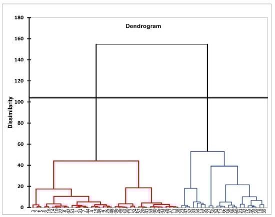 PCA is used to gather the studied variables into groups, while cluster analysis is used to group observations into clusters. The cluster contains observations that are like each other compared to other clusters [,]. In this study, agglomerative hierarchical clustering (AHC) classified the data into two groups (clusters).