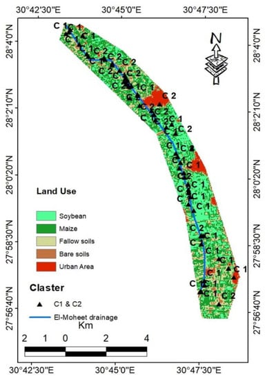 Figure 8 shows the land use of the study area around the El-Moheet drainage—the west side of the Nile River, El-Minia governorate, Egypt. Five classes were observed; agriculture crops (soybean, maize) in the summer season, fallow soils, bare soil, and urban areas that generally represent the main classes in the Nile Value in El-Minia governorate, Egypt []. Agriculture field crops (soybean, maize) are the dominant classes that represent about 70% of the total area, and urban (residential buildings and industrial areas) is the second dominant class, as it represents about 15% of the total studied area. The El-Moheet drainage is directed from the south toward the north. El-Moheet drainage is considered a pollution source as some farmers use such water for irrigating their crops due to the deficiency of clean irrigation water [].