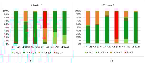Contamination levels for each studied heavy metal in Cluster 1 (a) and Cluster 2 (b).