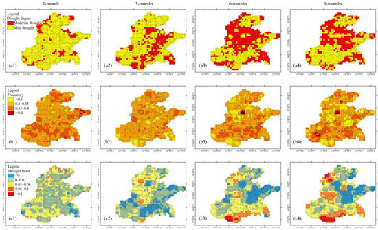 (a1–a4) Mean SPEI values. (b1–b4) Frequency of drought. (c1–c4) Spatial distribution trend of the SPEI during winter wheat growth in the NCP from 2001 to 2015 at 1, 3, 6, and 9 months, respectively.