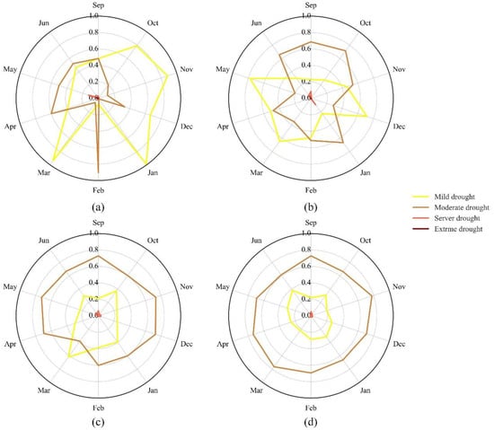 According to the annual variation, when drought occurred, it was mainly mild or moderate, and severe droughts were rare (SPEI-6 and SPEI-9 never experienced extreme droughts) (Figure 4). SPEI-1 was dominated by mild drought from October to January of the following year, followed by alternating mild and moderate drought, and then moderate drought gradually came to dominate. The frequency of moderate drought increased with an increase in the time scale, and the frequency of moderate drought in SPEI-9 was greater than 0.6 during the entire growth period of winter wheat. In addition, the jointing and heading stages of rapid growth of winter wheat were also dominated by moderate drought (except for SPEI-3), which had a greater impact on the final yield in rain-fed areas.