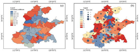 (a) Spatial distribution of the optimal correlation coefficient between the SPEI and the SYRS in 55 cities in the NCP. (b) Month and time scales corresponding to the maximum correlation coefficient, based on (a).
