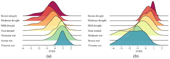 The sensitivity of crops to drought varied with geographic space, and the optimal correlation coefficient of the SPEI and the SYRS was positive or negative in the NCP (Figure 5). A negative correlation between SPEI and SYRS was present for the north-central, south-central, and southeastern NCP. In addition, the months and time scales with the maximum correlation coefficients were generally from October to February of the following year at short and medium-time scales (SPEI-1 and SPEI-3), indicating that drought at the short-time scale from seedling stage to greening stage had a promoting effect on the yield in these areas. The months with the highest positive correlation coefficient were mainly those of seedling to greening, but the time scales were mainly medium and long (SPEI-3, SPEI-6, and SPEI-9). The highest correlation coefficient was concentrated mainly in the seedling stage of winter wheat (over 80%), whereas the proportion of March and April with the highest correlation coefficient was small during the winter wheat growth period. We divided cities into two categories based on positive and negative correlation coefficients and evaluated the impact of drought on final yield (Figure 6). In cities with a positive correlation between the SPEI and the SYRS, the yield increased with the increase in precipitation and the wetness of the climate. By contrast, in the cities with a negative correlation coefficient, drought seems to have had a positive effect on the final yield.