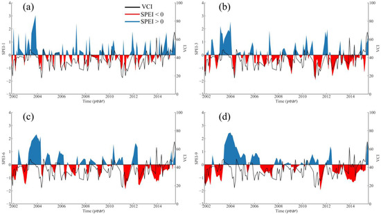 VCI and SPEI during winter wheat growth in Henan Province from 2001 to 2015 at (a) 1, (b) 3, (c) 6, and (d) 9 months.