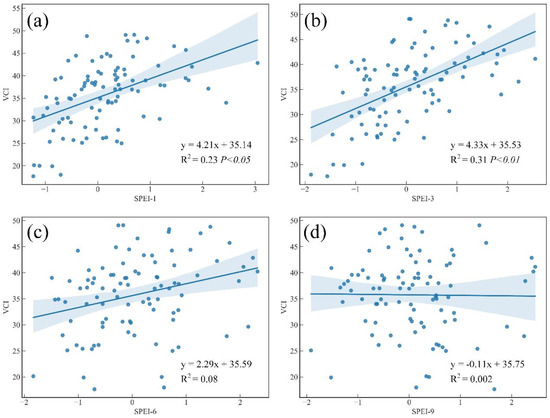 Correlation between VCI and SPEI during winter wheat growth in Henan Province from 2001 to 2015 at (a) 1, (b) 3, (c) 6, and (d) 9 months.