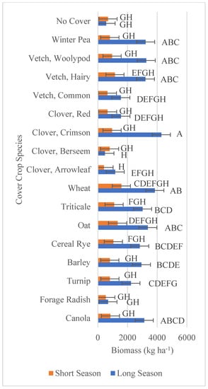 Mean biomass from cover crops grown under long-season (late Sept./early Oct. through mid/late April) and short-season (late Oct. through late Mar./early Apr.) conditions. Mean separation letters were obtained using Fisher’s Protected LSD. Means followed by the same letter do not differ statistically at p < 0.05. Bars indicate standard errors.