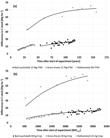 To analyze the effect of FOM input on C stock, we used a time series of C stock differences between a treatment with farmyard manure application and the corresponding treatment without manure in the three LTFE sites at Bad Lauchstädt, Gross Kreutz, and Rothamsted, as already described in Section 2.3. Figure 1a shows the conventional representation of SOC stock differences over time in years. For each site, a different dynamic is visible, leading to site-specific SOC equilibrium levels (data not shown). Obviously, the relationship between different levels of SOC stock differences does not reflect the relationship between the different FYM input levels. More convenient results gave the fitting of the approach in Figure 1b, where Equation (3) was applied on the BAT scale. Now, it is possible to describe the development of SOC stock differentiation with one model where the site-specific drivers were the time scale as cumulative BAT, and the C flux is the BAT-related Crep input.