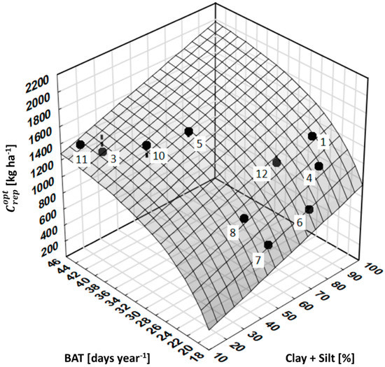 The C flux values that correspond to the experimental SOCopt values were calculated based on the site-specific data shown in Table 1 and were satisfactorily predictable from soil texture in terms of clay and silt, and BAT (Equation (4), Figure 2):